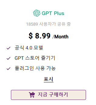 오픈 AI에서 챗GPT 공식 이용료를 지불하려고 확인해보면 한 달에 20달러인 것을 어렵지 않게 확인할 수 있을 것이다. 하지만 고잉버스는 계정쉐어 서비스를 제공하기 때문에 GPT Plus는 한 달에 8.99달러, MT-GPT는 12.99달러에 이용할 수 있다.